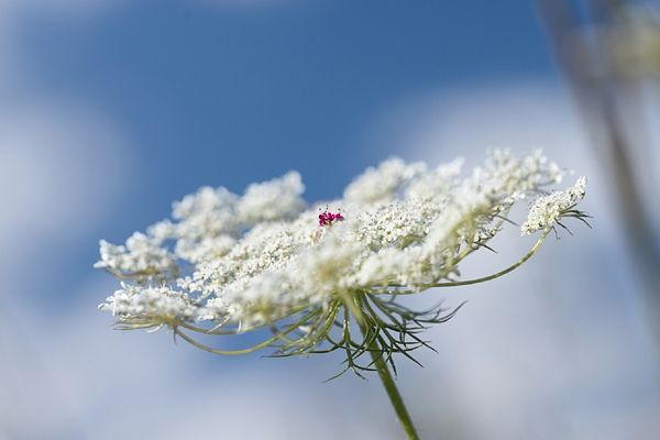 野蘿蔔花又稱為蕾絲花,為野蘿蔔所開的白色花朵。傳聞有一天英國安妮女王與朋友一起刺繡,朋友起鬨要她繡出像花一樣美麗的蕾絲,安妮女王就以野蘿蔔花為範本,用巧奪天工的手藝繡出了精緻的蕾絲,卻不小心被針刺到了,滴了一滴血,跟著野蘿蔔花流傳了下來,因此又名「安妮女王的蕾絲」。在「蕾絲花」花序的中央,會有一簇深紫紅色的迷你小花,傳說就是安妮女王流下的那滴血,但其實是為了吸引昆蟲來幫助授粉繼續繁衍。帶有溫柔浪漫的色彩,猶如女王身上的蕾絲花布,展現女性自信卻又柔美的一面,又象徵智慧與理性,花語為「惹人憐愛的心」,即使如女王般自信理智,內心卻又渴望被憐愛。