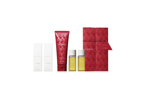 THREE熱賣10年的美白精華,小分子導入精華,直達基底的深層美白,讓肌膚呈現自然透亮感,忠孝SOGO獨家贈送「肌能潔膚油」、中壢SOGO獨家贈送「平衡潔膚油R」、台中新光獨家贈送「肌能洗顏皂霜」;大葉高島屋、漢神巨蛋推出淨白雙瓶組贈「平衡潔膚蜜加量版」、「平衡潔膚組(兔年限定)」