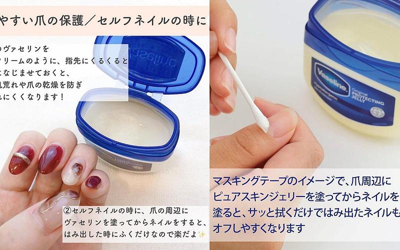 如果沒有特別購買指緣油的人,其實可以使用凡士林做取代,使用棉花棒沾取少量塗抹於指緣邊,再用指腹按摩至吸收,能減緩乾燥硬皮的生成。