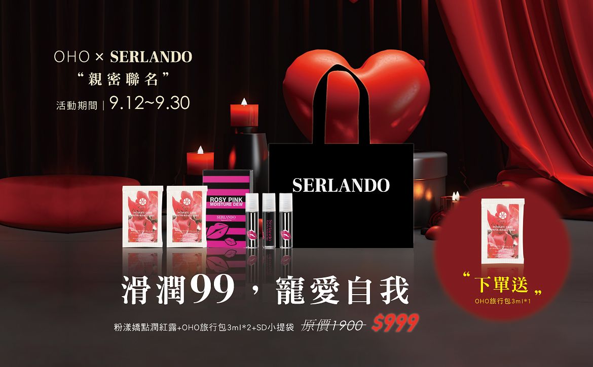 還搭配長銷經典唇露 ╴粉漾嬌點潤紅露,推出《九月限定|滑潤99組 》組合內容包含 「粉漾嬌點潤紅露 三入組x1+OHO私密護理水性潤滑液 旅行包 3mlx2包 贈 SERLANDO品牌提袋」,總值$1900的組合,9月寵粉回饋只要$999