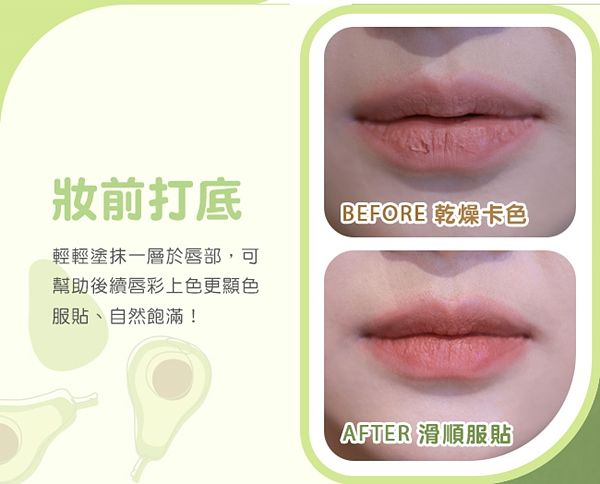酪梨彈潤滋養唇膜也非常適合妝前使用,質地輕盈好塗抹,一抹瞬間均勻柔化清爽不黏膩,妝前調理唇部肌膚狀態,幫助後續唇彩上色更顯色服貼,輕鬆打造誘人魅力雙唇。此外也適用於日夜護理,日間可以當護唇膏使用,薄擦修護滋潤雙唇,夜間睡前厚敷,全日持續修護,一覺醒來雙唇彈潤水嫩。