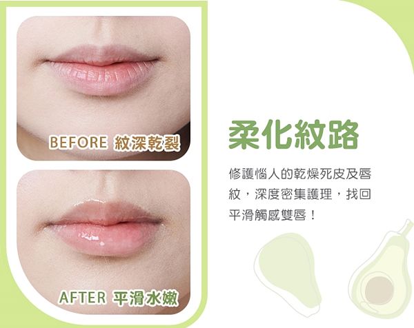 除了從頭自帶誘人香氣外,臉上細節保養也不容錯過,平時容易被忽略唇部肌膚,需再次被好好重視及細心呵護,想改善雙唇乾燥、暗沉、唇紋問題,除了多喝水及定時為唇部去角質外,定期保養可以幫助唇部肌膚保持良好狀態《#1028 酪梨彈潤滋養唇膜》使用超級營養酪梨萃取精華,一敷即刻修護,防止雙唇乾燥、保持柔嫩。