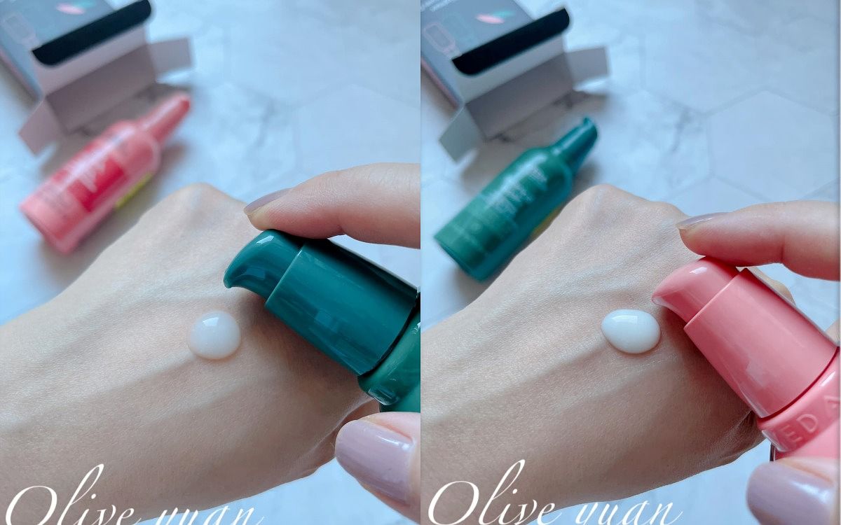 綠瓶為「花植結構重鍵馥活精萃(100ml)」,粉紅瓶為「蘊活光萃Omega 5璀璨精華乳(100ml)」。