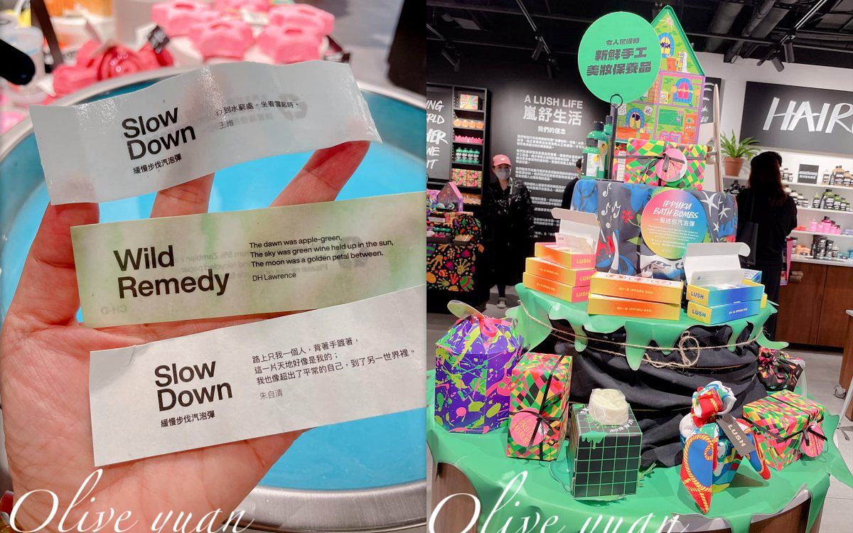 很快的!LUSH聖誕節限定也上架了!所以某天晚上又跑去LUSH西門店玩樂!發現店員正在示範兩款汽泡彈~「清新果子」與「SLOW DOWN」~有趣的是,裡面居然藏有隱藏版詩詞~而且居然還有王維、朱自清,好國際化的商品喔。