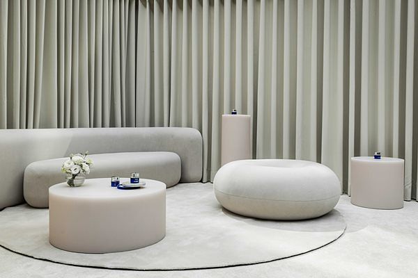 走出迴廊影音區,映入眼簾的是以溫暖奶油色調包覆的沉浸空間,此區是設計師Sabine為La Prairie獨家訂製的傢俱展示區,眼前由荷蘭空運來台的Sabine訂製傢俱的柔和線條和曲線,完美體現設計師Sabine的經典風格,讓人彷彿沉浸在魚子美顏乳霜的奢潤包覆質地中。在鑑賞訂製家具的同時,也能同步享受La Prairie「魚子美顏奢華保養體驗」,感受La Prairie奢華保養儀式。