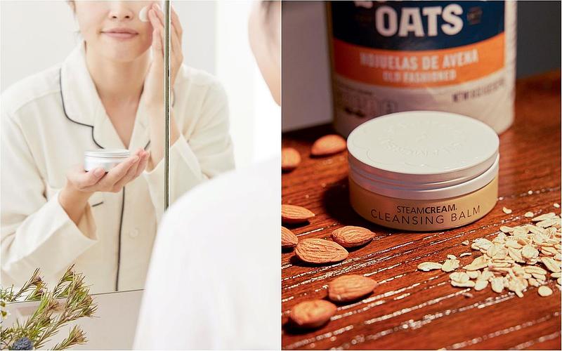 可兼具保濕與卸除的「蒸汽乳霜 精油潤膚卸妝膏」,添加杏仁油等植物油,溫和卸妝肌膚無負擔。