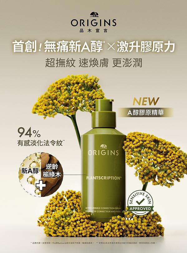 全新A醇膠原精華是結合了「無痛新A醇」和「逆齡榆綠木」的終極高效組合,可在短短 2 週內淡化最頑固的細紋,並加強肌膚的緊緻澎潤。除此之外,更添加「撫紋6胜肽」和「深海巨藻萃取」,以4大抗老霸主成分全面達到+32%膠原力*、94%有感淡化法令紋**、97%有感淡化抬頭紋**、97%煥膚柔嫩***、96%緊緻毛孔****的傑出成果。