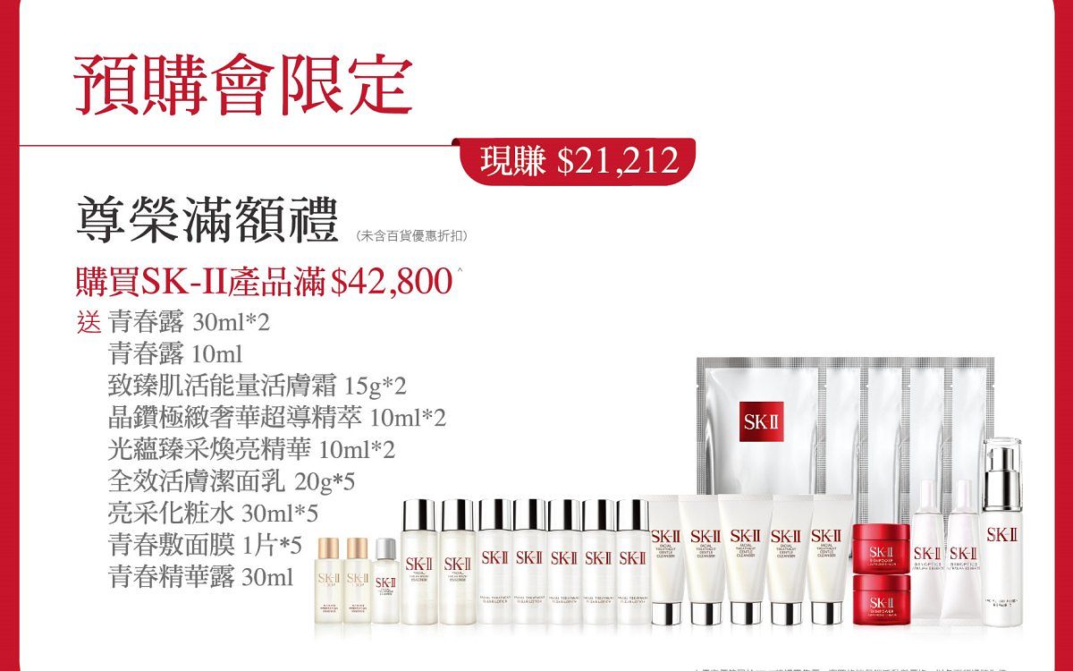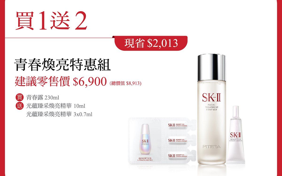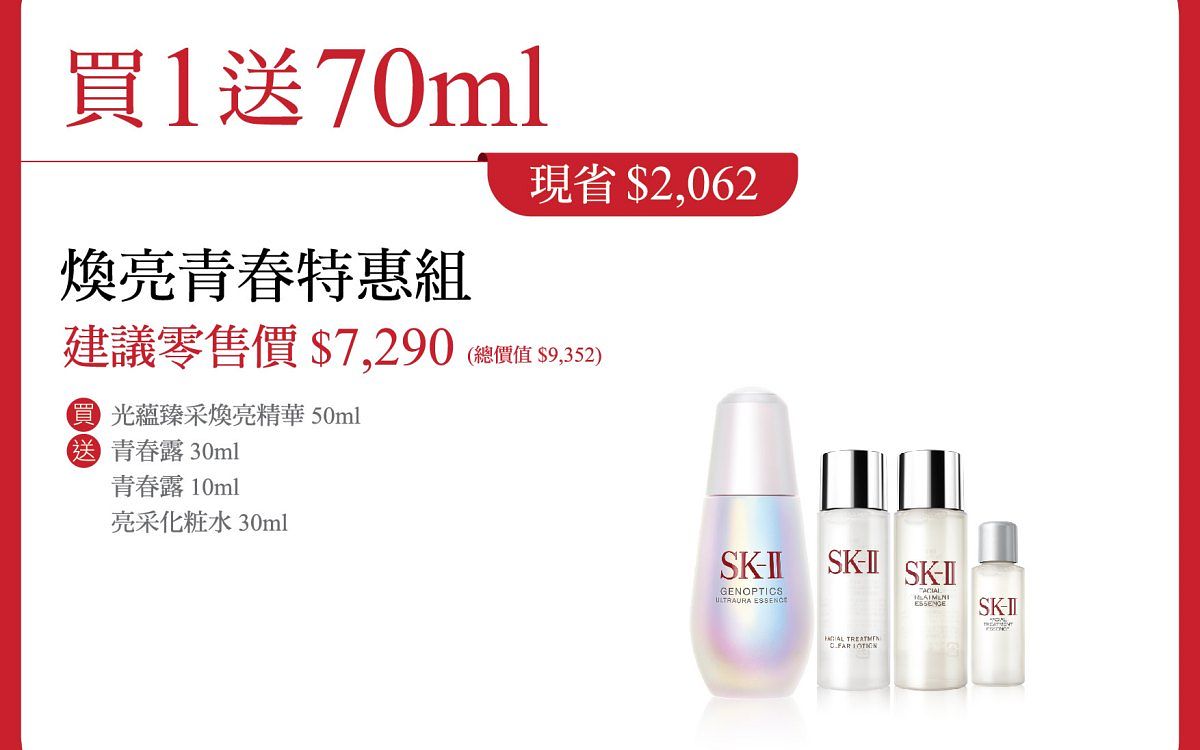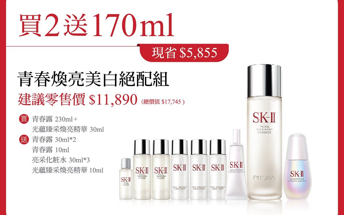 贈品: SK-II 青春露 30ml*2 + SK-II 青春露 10ml + SK-II 亮采化粧水 30ml*3 + SK-II 光蘊臻采煥亮精華 10ml