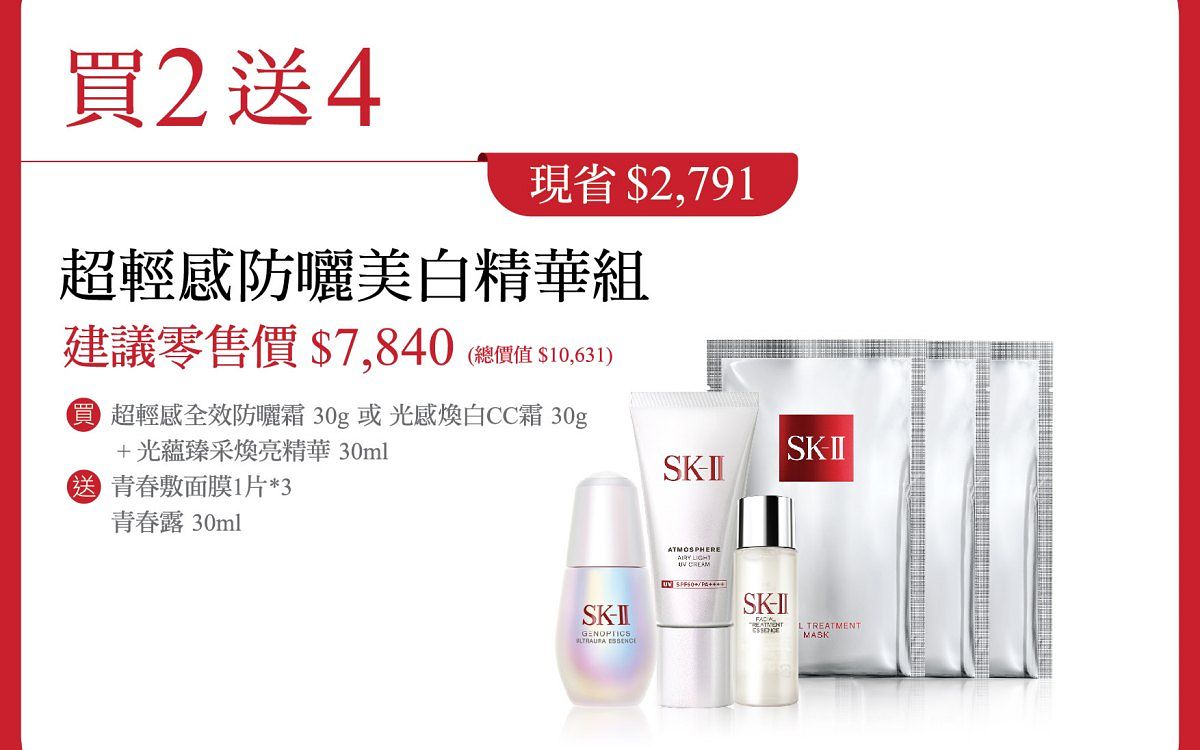 贈品: SK-II 青春敷面膜2片 + SK-II 亮采化粧水30ml + SK-II PITERA™
