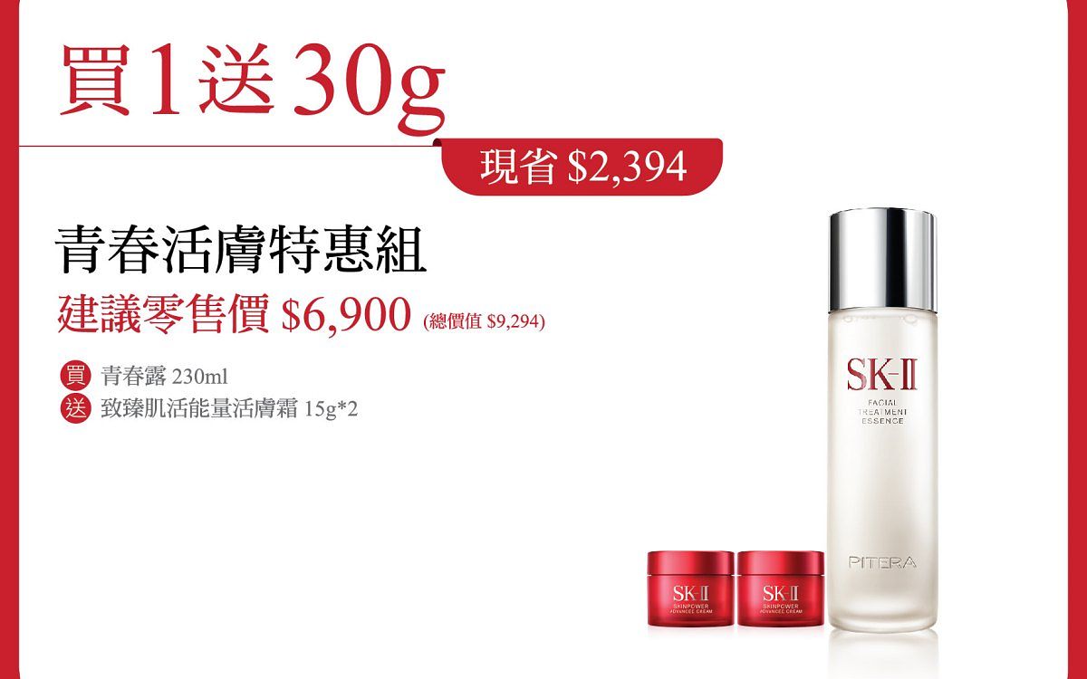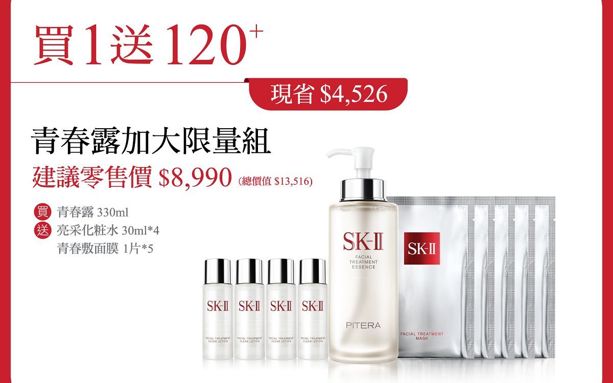 贈品: SK-II 青春露 30ml + SK-II 青春敷面膜 3片