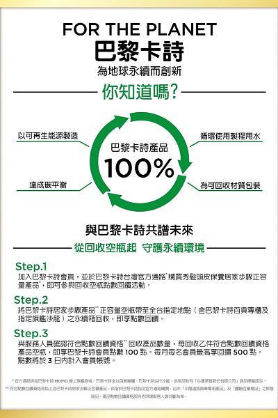 加入巴黎卡詩會員,並於巴黎卡詩台灣官方通路*購買「巴黎卡詩居家步驟產品」**正容量產品,即可參與回收空瓶點數回饋活動。