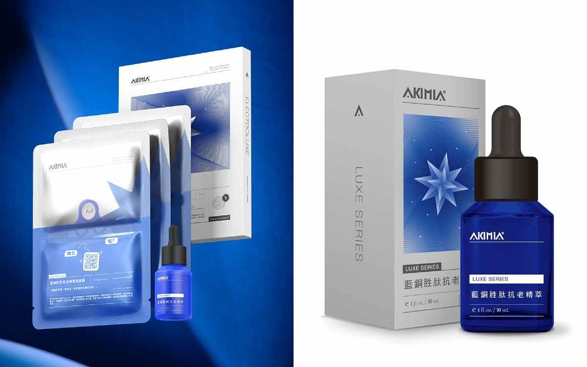 本次全新系列選用頂級反齡科技成分——「藍銅胜肽」,他的外觀呈現藍紫色,是人體中自然存在於血液、唾液與尿液中,血液中的藍銅胜肽濃度隨年齡遞減。AKIMIA希望做到鎖定老化源頭,填充緊實彈力新生機,反重力賦活平滑無痕膚表,幫助重現澎彈緊緻、平滑煥發!新系列上市同步推出「抗老微電流面膜」及「抗老精萃」,兩品搭配一起使用,透過微電流深層滲透雙效藍銅,有效成分透過電流深層導入肌底,抗老修護效果更佳!