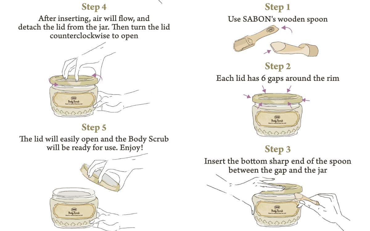STEP1:使用SABON木匙或金屬棒,在身體磨砂膏瓶蓋和瓶身之間,找六個小空隙。