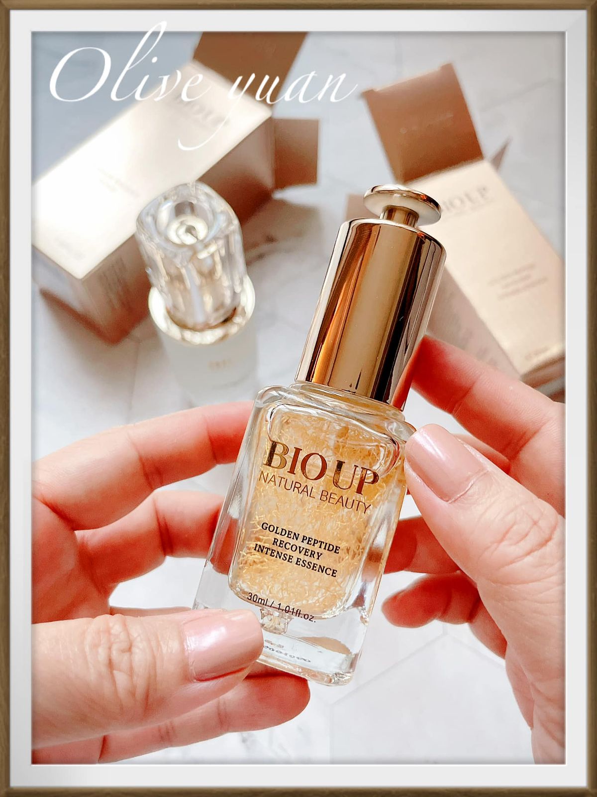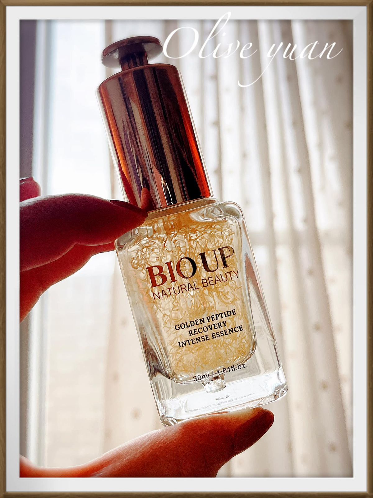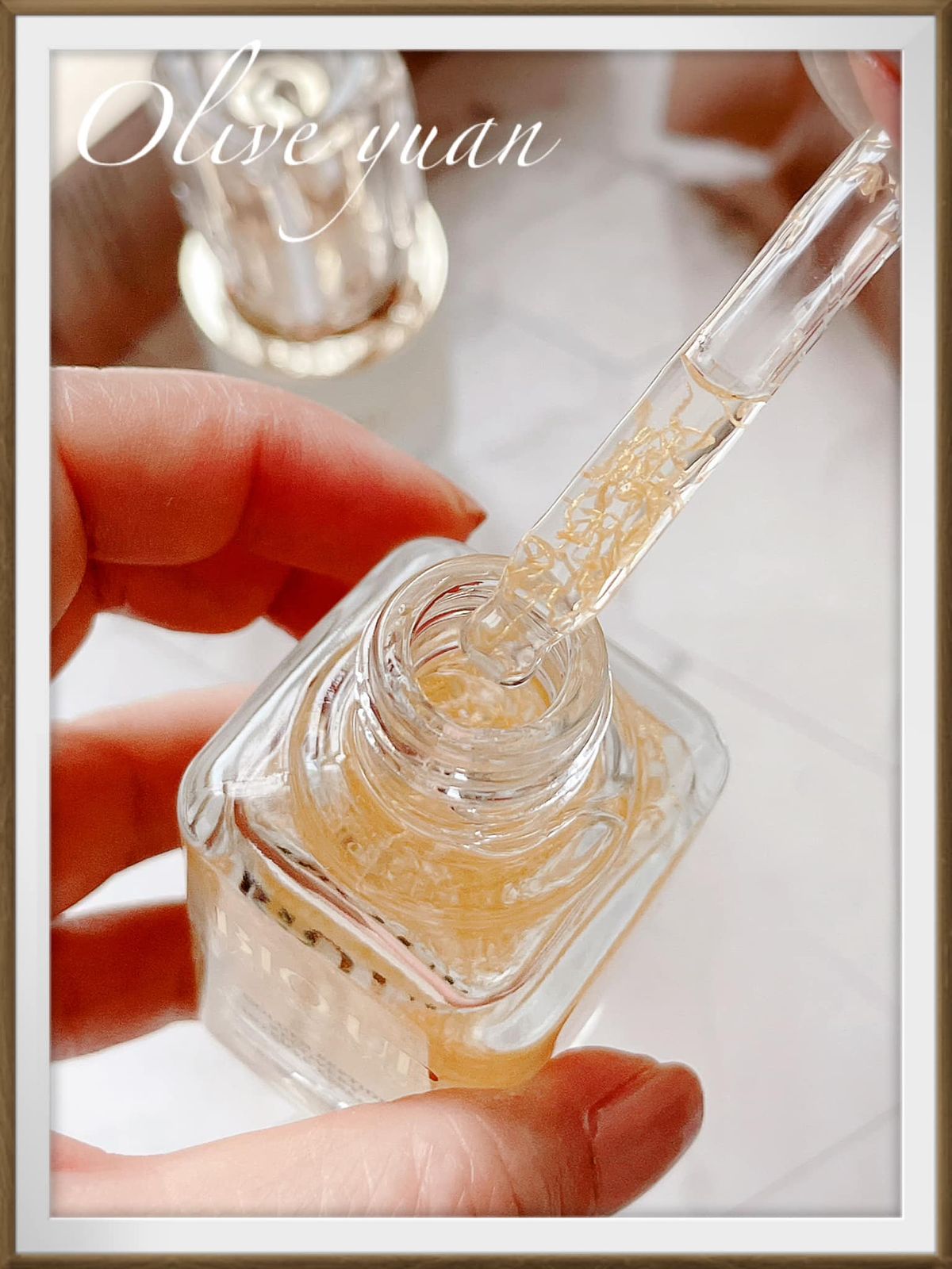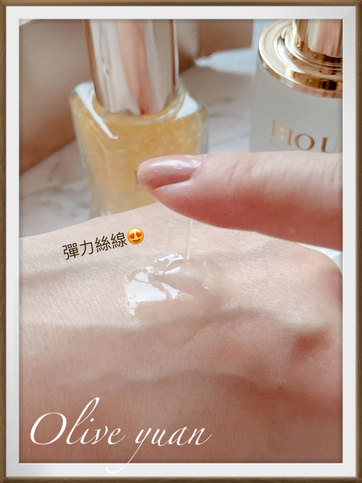 「超逆引回彈黃金麴安瓶*30ml」好美喔!難怪被稱為“黃金美人瓶”!裡面細細的黃金絲線為「24K黃金活顏胜肽」,也是一種黃金微米載體,在肌膚上推開會溶化,結合三胜肽及玻尿酸胜肽等,能作用於玻尿酸、彈力蛋白、膠原蛋白及多配體聚糖-1等部位。