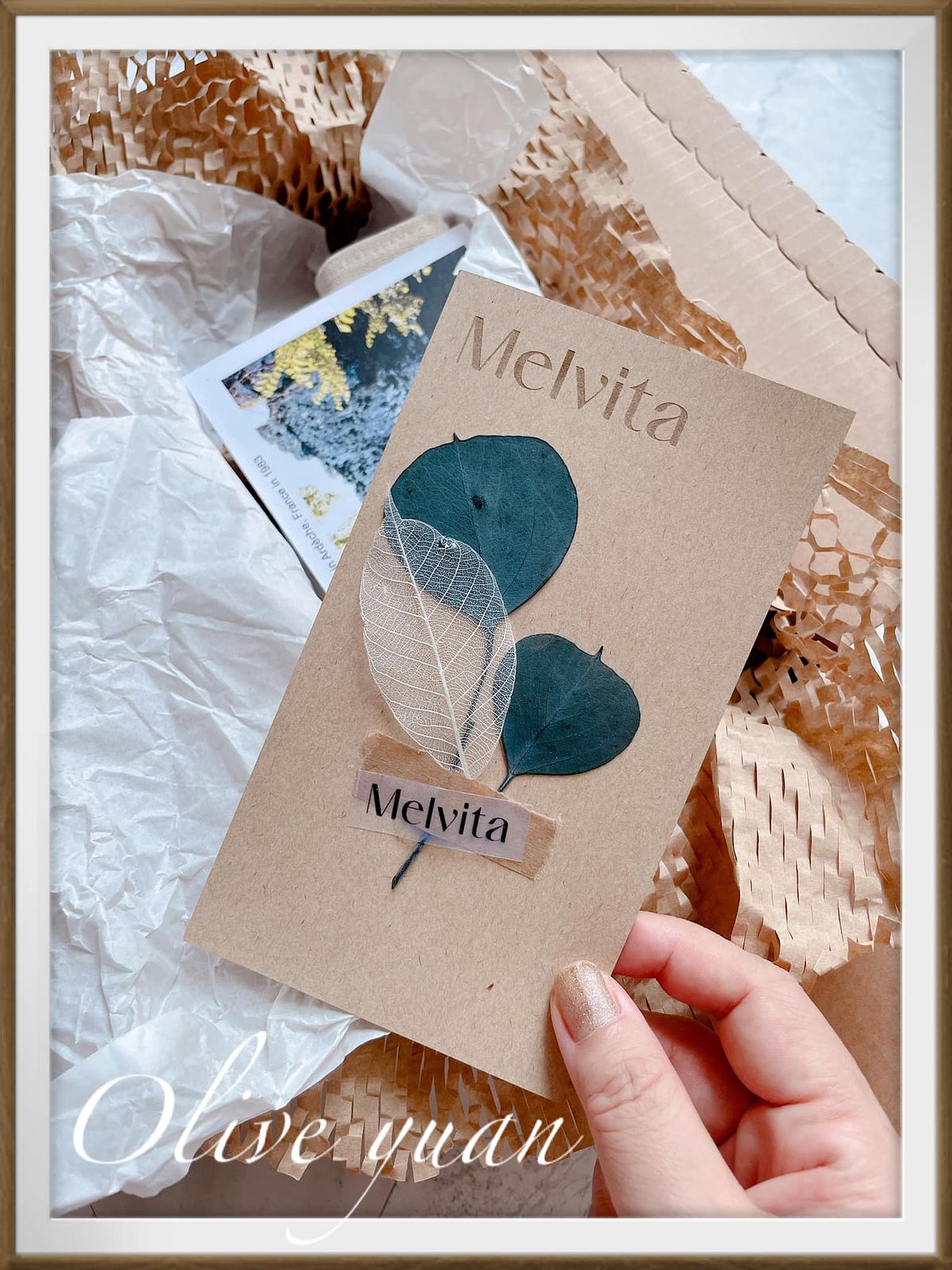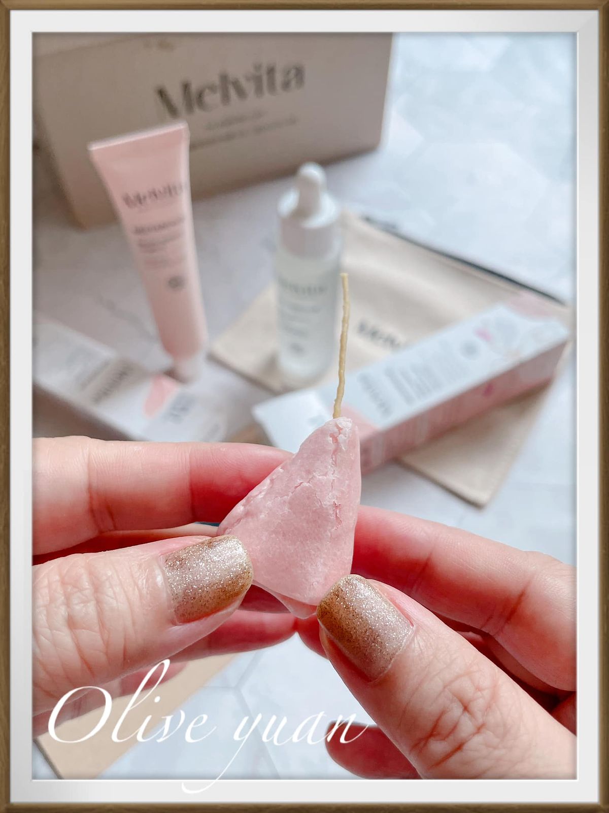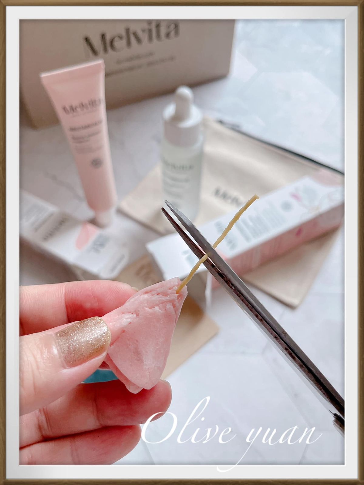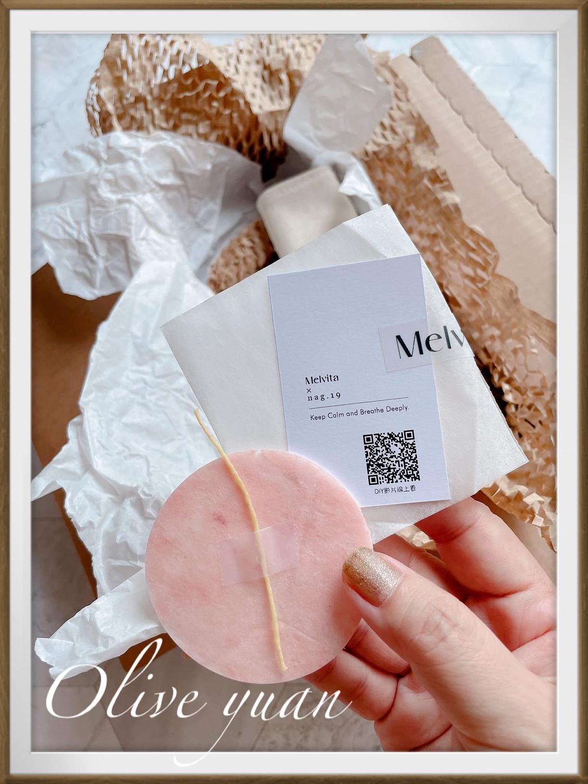 另外禮盒還有個小東西很妙!說是Melvita與nag‧19(那個製研所)聯名的小東西,是一小片蠟,掃QR code進去看影片才知道它可以變成小蠟燭耶!太也趣了!將棉芯包起來折一折,折成小三角錐再點燃即可。