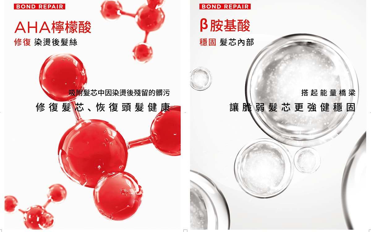 2. 首創^髮芯強化科技:以三臂AHA檸檬酸*與β氨基酸的結合,內修復、外穩固髮芯,讓髮絲恢復健康強韌