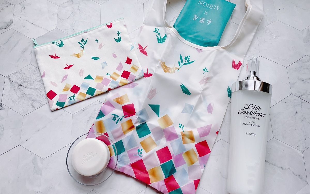 圖片來源:觀玲老師限定二:與日本京都擁有400年歷史的織品老店「永樂屋」合作,設計兩款50週年環保購物袋及收納包,圖騰為日本文化中擁有祝福意涵的「鶴」,及健康化妝水「北之薏仁」,傳遞健康與平安順遂的概念。(「永樂屋聯名限量歡慶組」送收納包,滿額再送環保購物袋)
