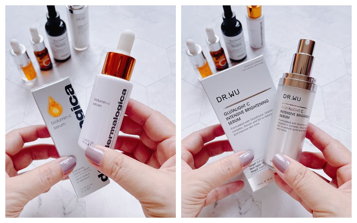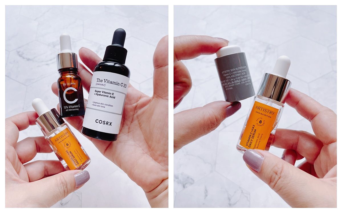 「ARTYSTRY橘色小亮瓶」為分離式設計,使用前才將真空維他命C粉末與精華液混合,並趁新鮮用完,「Dr.May C15%+抗氧法莎酚」則為保養最後一道使用,全臉只要3滴的無水精華效果佳,「韓國COSRX C23」濃度更高,但還搭配B5及維生素E,開瓶需2個月內用完。