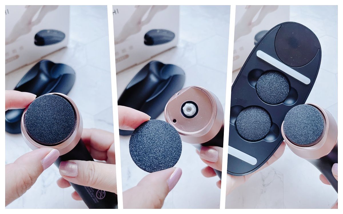 它的底座其實也是磨頭收納處,一機附有細、中、粗3種磨頭,替換及清洗方式也非常簡單,另外磨頭採圓弧設計,可接觸更多足部面積!但使用前需先泡腳、軟化硬皮後效果更好,所以建議洗澡後使用,用完後也要記得保養喔!