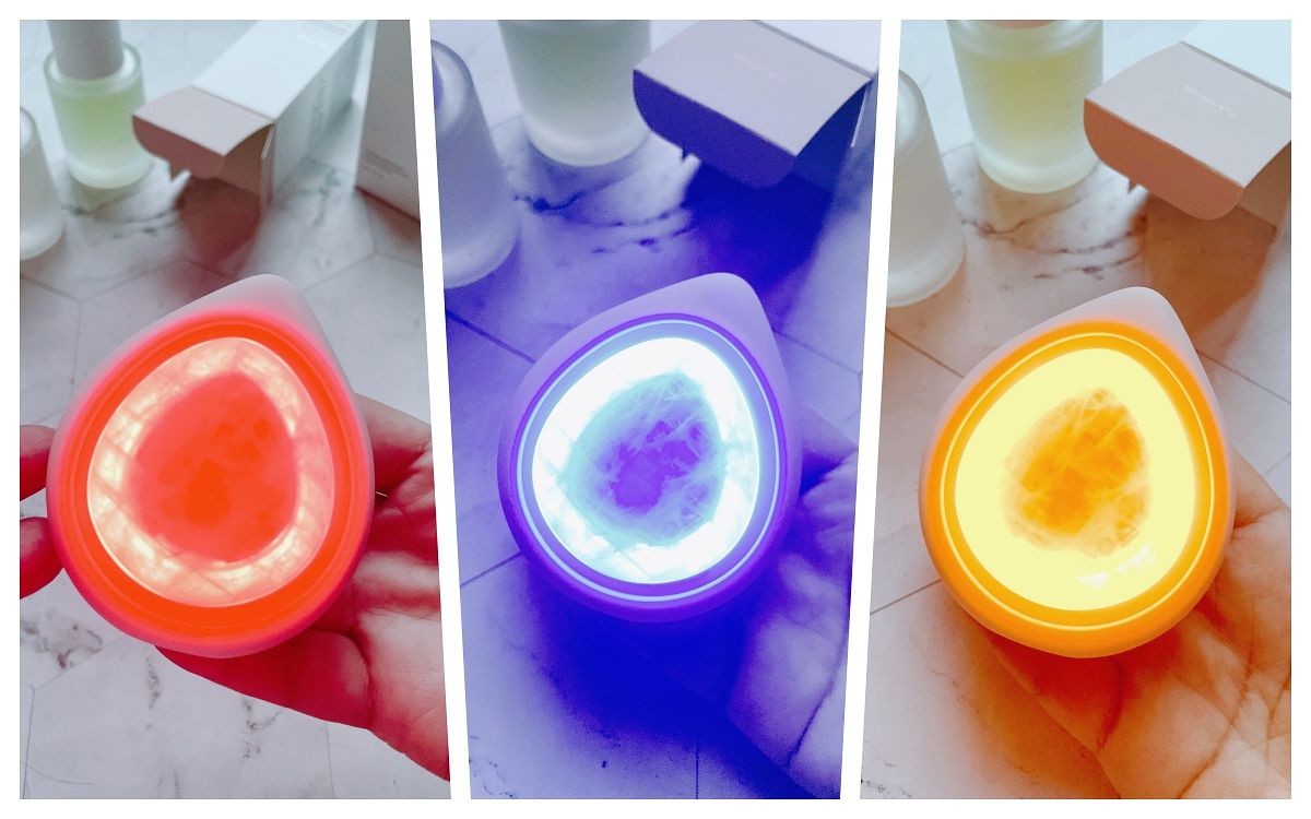 然後“光美容”的部分是這樣!LED聚光科技有3種光,保養完後就可以選你要的“光”幫肌膚按摩、導入,藍光作用於最淺層,針對油光問題,接著黃光再往下,針對補水修護,紅光我最愛,作用於最深處,針對緊彈紋等困擾!
