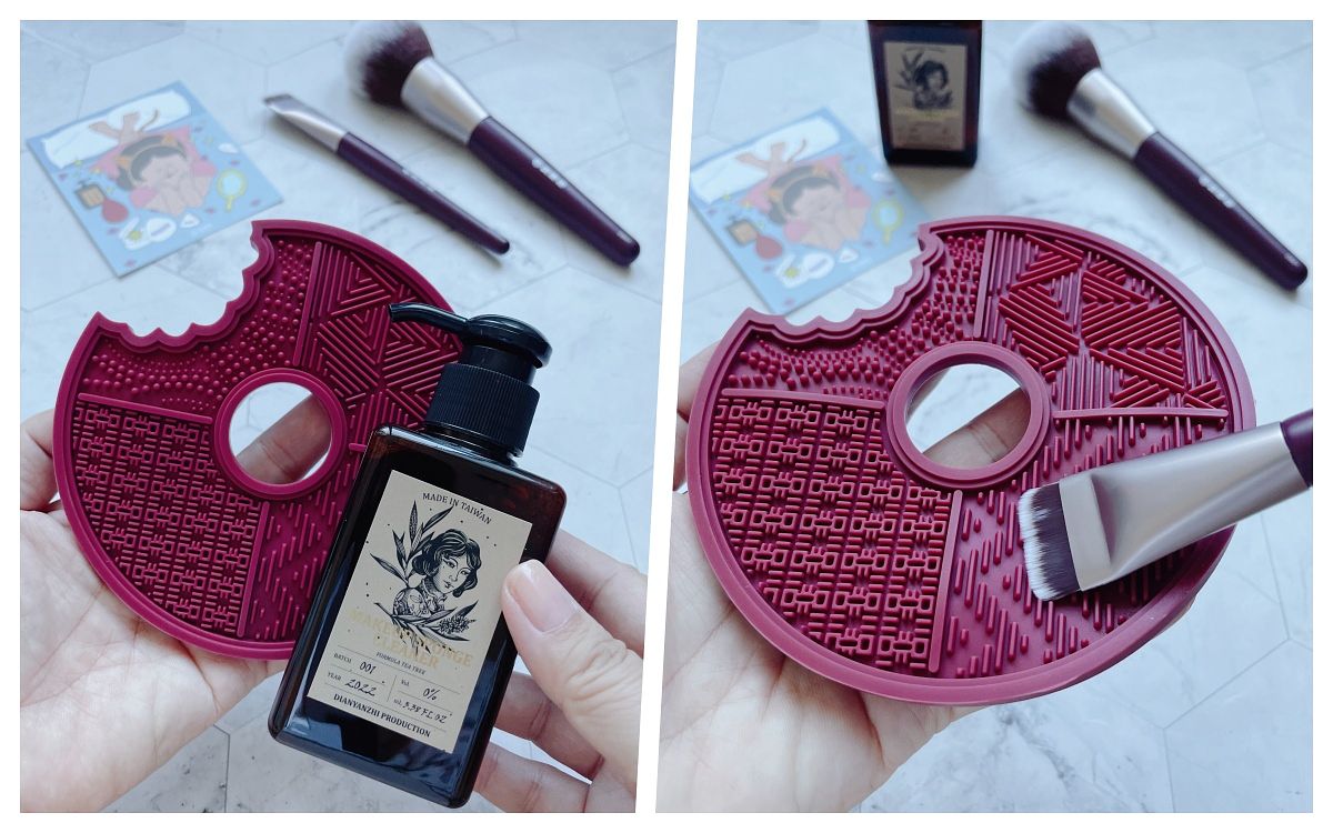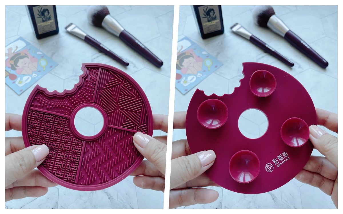 這清潔盤的造型好可愛,像被咬了一口的大餅,它是用柔軟矽膠材質做成,能搭配專用清潔劑、溫和清潔不傷刷毛,「點胭脂清潔劑」還添加了天然茶樹精油,也可以洗粉撲及彩妝蛋。