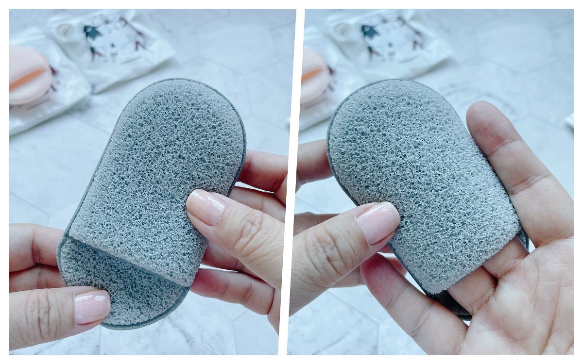 這產品材質跟美妝蛋一樣,泡水會膨脹1.5倍,材質變得很柔軟,而且用法多多,將清潔用品擠在上面可幫助起泡,洗臉時還可去除老廢角質,另外敷泥膜總是很難清洗,也可以用它來幫忙,身體也能用喔!但力道一樣不宜過重。