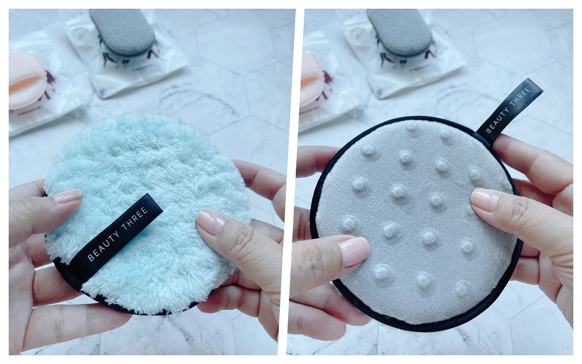 它的尺寸還挺大的,而且算是環保省錢道具,因為不需使用清潔用品及化妝棉就能卸妝,例如絲滑短絨面可用來卸除防曬潤色隔離那種淡妝,水藍色長絨面則可用來卸除濃妝,還可重覆使用,但防水彩妝得先卸除喔!