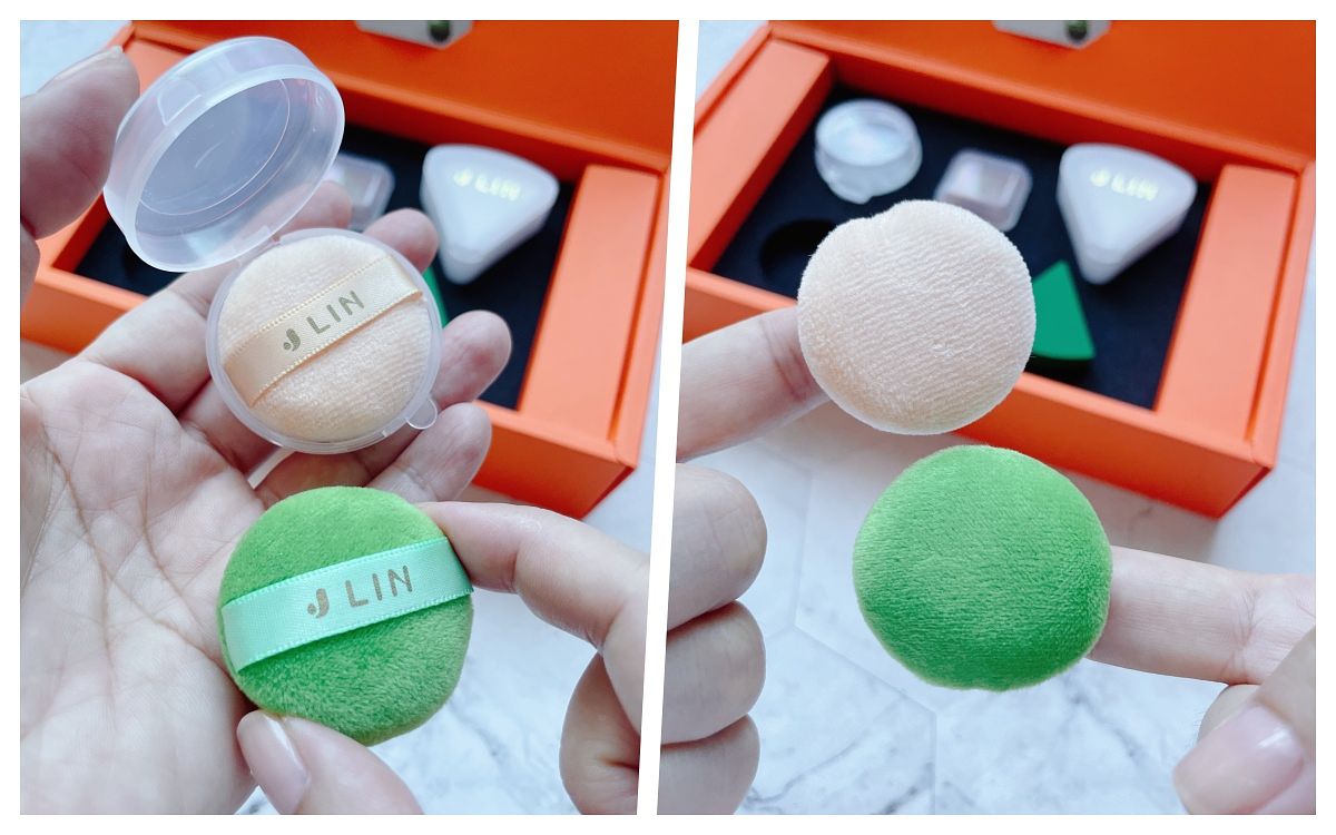 「循環軌跡圓形手指蜜粉撲」、「行囊拼圖四方形蜜粉手指粉撲」材料採用日韓共同研發新技術─「絲絨面料」,而粉撲夾層透過精密計算毛料面孔進出氣體,讓粉撲可均勻受粉。組合內還搭配專屬旅行盒,不讓粉撲沾細菌。