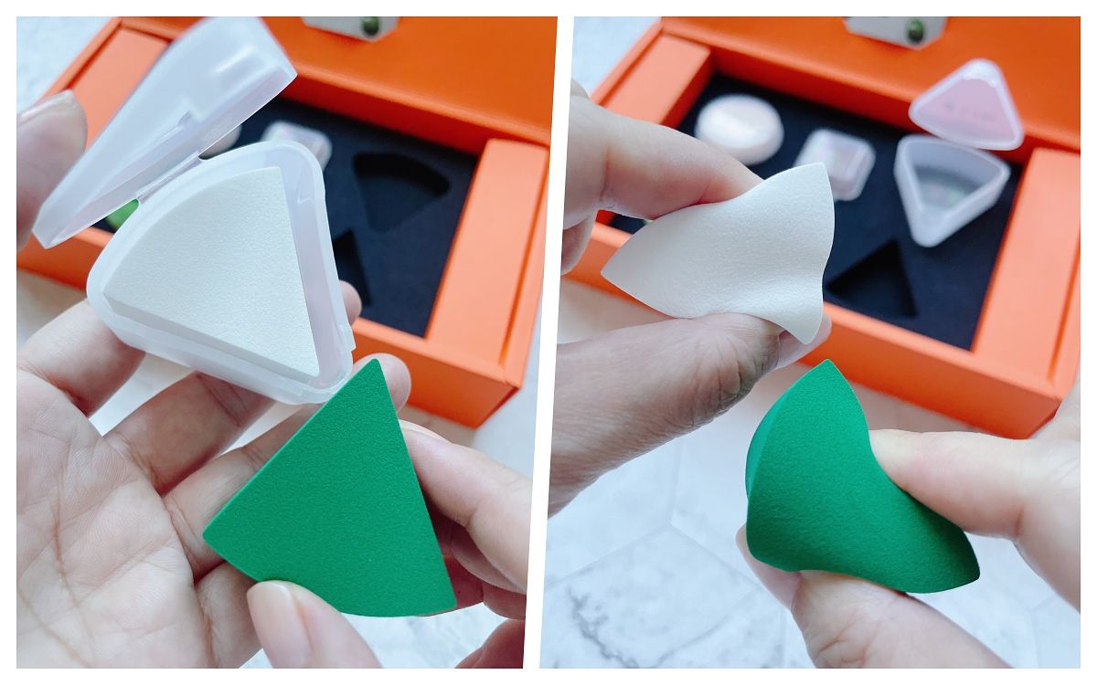旅行時可以「山的輪廓三角粉撲」取代大圓型粉撲,而且有著各種角度的小巧三角型,更能針對臉部的小細節做底妝修飾。