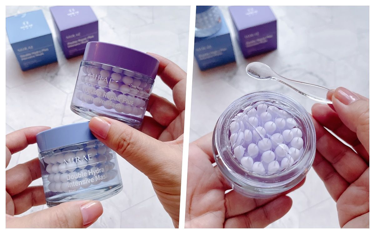 平時保養一次取一顆,膠囊乳霜與外層包覆的清爽凝膠一起推開,冰涼潤澤兼具,晚上如果想當晚安面膜厚敷就取2顆,保濕款有7重玻尿酸、B5及9重抗老胜肽,修護款有積雪草、水解膠原蛋白及B3衍生物,2款可交替使用。