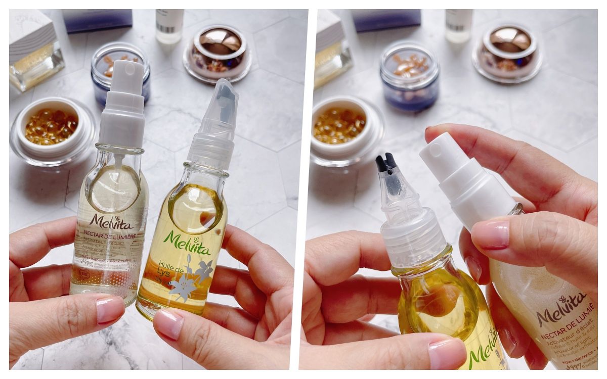 Melvita是有機植物油專家,光是100%純油就有超過10種以上,連沒聽說過的油都有,右邊那瓶就是100%百合花油,主要針對肌膚的勻淨透白,這種純油的好處就是全身上下都能用,還能添加在乳液或乳霜中使用。