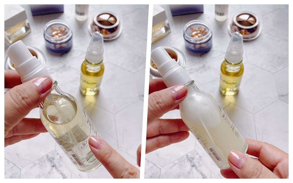 但雙效露更適合初學者使用,因為它是20:80油水雙質地,20%的山茶花油,加上80%的彩虹藻萃取精華,加上AHA及3%新一代PHA果酸,只要搖一搖,噴一噴,拍一拍,無油感還能順便軟化角質,這款也是我的心頭好。