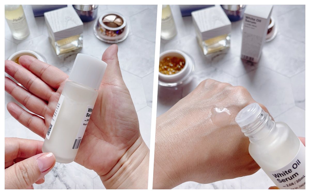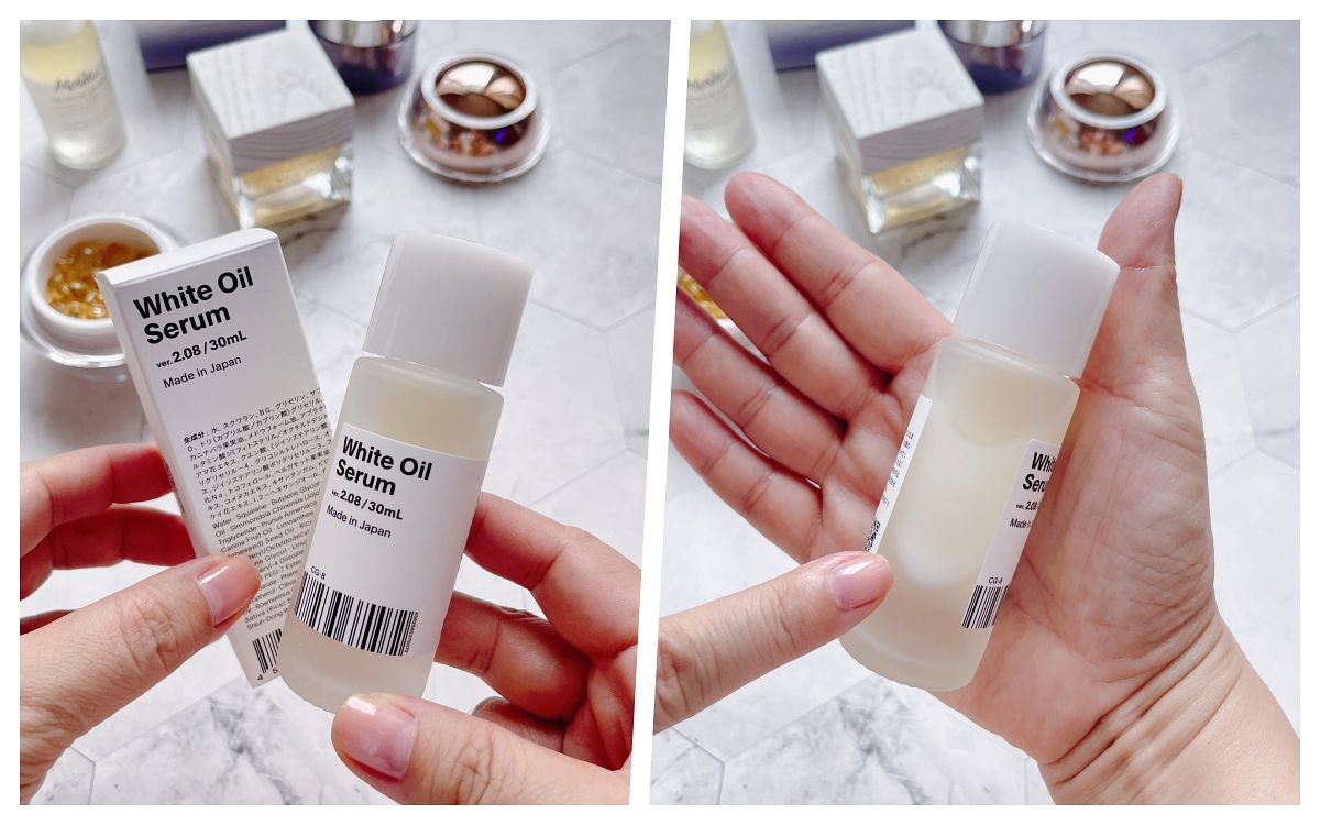 “油層”主要有8種精選植物油,例如角鯊烷、荷荷芭油、蓖麻油、薔薇果油等,“水層”為高濃度維他命C衍生物、白蘭花、火龍果萃取,化妝水後只要用這瓶即可,因為搖晃後的「白油」會產生乳液、乳霜功效!讓保養更短時!