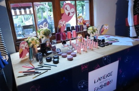 這次合作的限定彩妝產品有「絕色晶透唇萃」、「水聚光淨白氣墊粉霜SPF50+ PA+++」、「零毛孔無瑕氣墊粉霜SPF50+ PA+++」以及「魔幻貓頭鷹眼頰彩盤-晨光初戀」等15個限量聯名彩妝,也因為LUCKY CHOUETTE是服裝設計師品牌,所以現場除了品牌服裝,也佈置成金在賢工作桌的感覺!