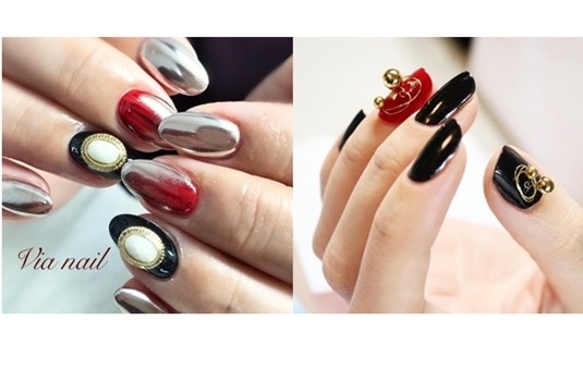 黑紅配色的指彩十分適合跑PARTY的女孩,霸氣又帶點高貴的性感,再加入金屬元素的點綴,讓指尖更顯知性質感氣息,一舉一動閃耀著金屬光澤,非常適合個性派的女孩們,簡直就是美翻天!
