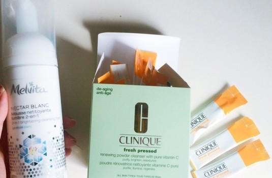 我平常會以兩種洗臉產品交替使用,晚上時我會用「CLINIQUE 瞬效亮白維他命C洗顏粉」,這款洗顏粉富含新鮮的維他命C成分,沒有什麼味道,在洗臉按摩的時候我會稍微讓它膚在臉上約1 分鐘後沖淨,洗完臉部肌膚立刻透亮(真的不誇張)!因為它是小包分裝,所以之前出差時我也是帶它出國,早晚都用它洗臉,結果素顏的肌質立刻被誇像是自體發光,被誇獎之後我更不能沒有它了(笑)。