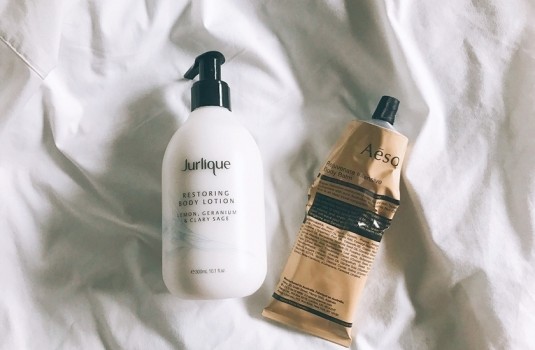 我現在愛到不行的身體乳霜有「Aesop滋潤芳香身體乳霜」&「Jurlique香檸天竺葵與快樂鼠尾草身體乳」。很喜歡這兩款的原因最主要就是因為真的「很好吸收」,有滋潤的保濕度卻不會留下黏膩感,這是我首選的條件~