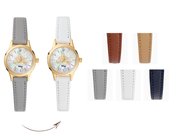 在設計上,不僅於面盤12點鐘的位置鑲嵌代表每部作品的彩色寶石外,更於手錶的面盤以白蝶貝作為裝飾,中央以金色圖樣象徵各公主系列主題。手錶背面細節處也絲毫不放過,每個不同主題的手錶面盤背面,皆刻有迪士尼公主的輪廓。願喜愛公主角色的你,將憧憬的迪士尼公主佩戴於身,編織出屬於自己的精彩故事。