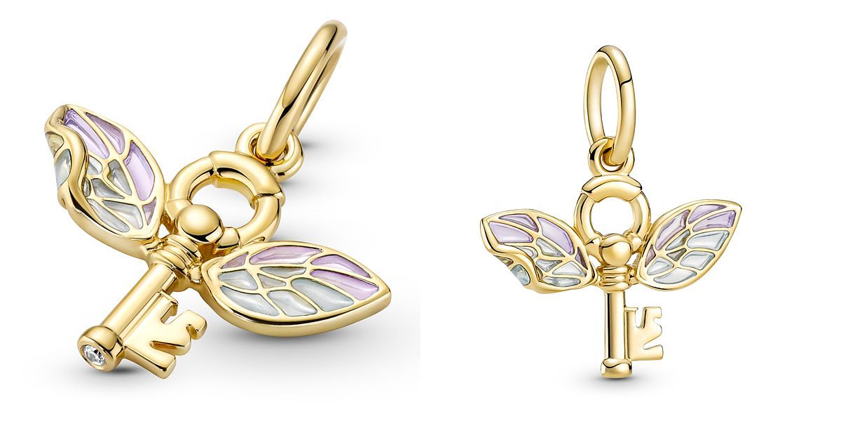 《哈利波特》飛天鑰匙吊飾以守護魔法石的飛天鑰匙為靈感,鍍14k金鑰匙上的翅膀以鏤空琺瑯工藝裝飾而成,呈現生動的半透明透光效果,有如染色玻璃般的色澤;翅膀細節設計源自於哈利騎上房間中的飛天掃帚,並需要抓住一把翅膀被折斷的鑰匙以防止佛地魔獲得魔法石。NT 3,280
