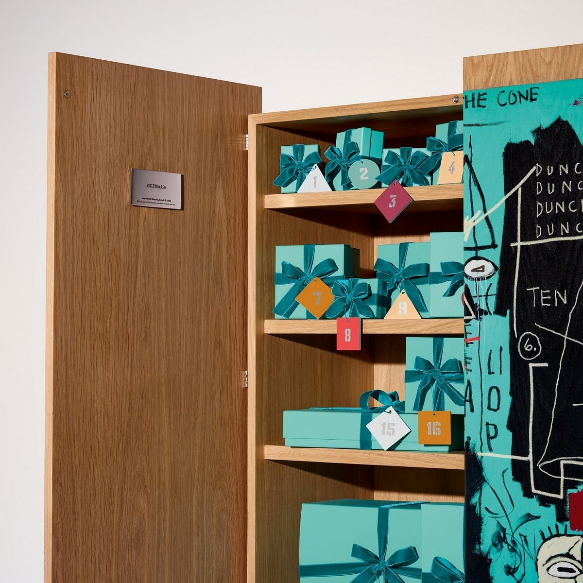 倒數日曆的外觀也令人驚喜,不是以最經典小藍盒外觀做主要設計,Tiffany今年選擇以巴斯奇亞擅長使用的非傳統素材為靈感,將《Equals Pi》之作呈現於四英尺白橡木的木門上,此作由數學方程式、文字、人像、豐富表情和符號所組成,體現了樸實而充滿研究精神的創作態度!這款超夢幻年度禮盒目前已經開賣囉,有興趣的妳可至鄰近櫃點洽詢。