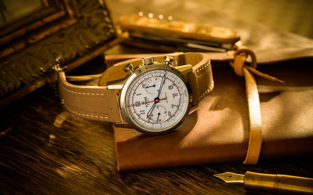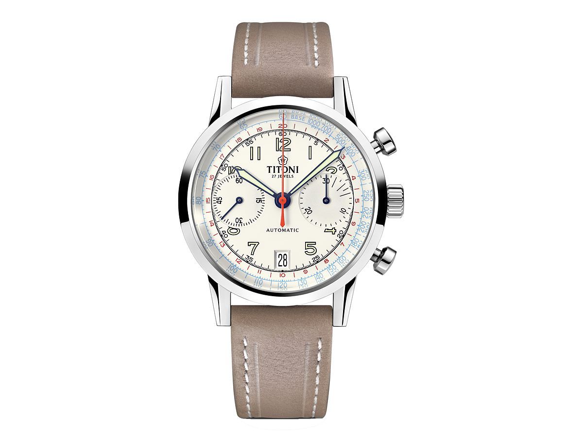 為表現50年代品牌在歐美深受喜愛的精湛工藝,瑞士TITONI傳承計時系列,面盤運用老式的品牌復古LOGO,呼應懷錶應用廣泛的凸面式面盤靈感,同時運用古典氣息濃厚的奶油色,為面盤灌注時代的蒼勁神韻,搭配復古時標、教堂式指針與凸面球型玻璃,體現濃厚復古華麗與速度神采,不僅交匯出令人激賞的並存美感,體現瑞士TITONI致敬往日經典的時代情懷。