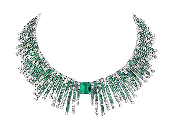 18K 白金,主石為 1 顆哥倫比亞祖母綠,總重約 12.59cts、57 顆長形切割黑色蛋白石,總重約 5.90cts、50 顆方形切割美鑽,總重約 5.90cts、234 顆圓形切割美鑽,總重約 19.94cts、395 顆長型祖母綠,總重約31.95cts
