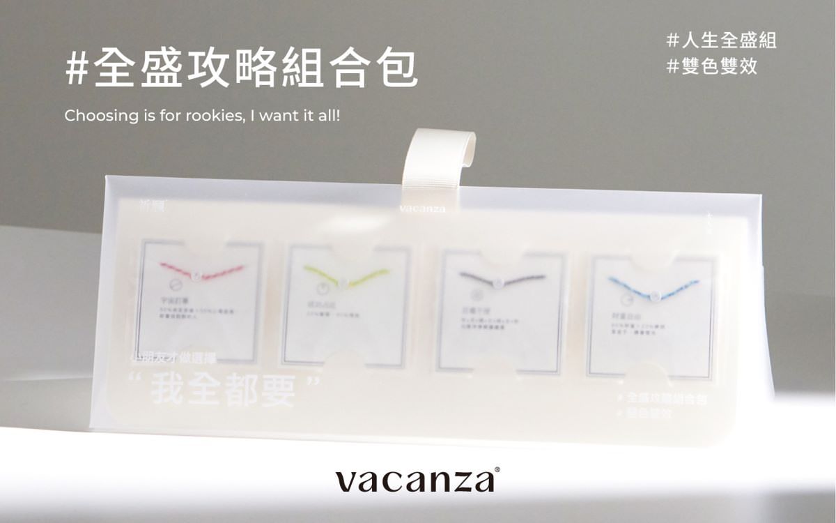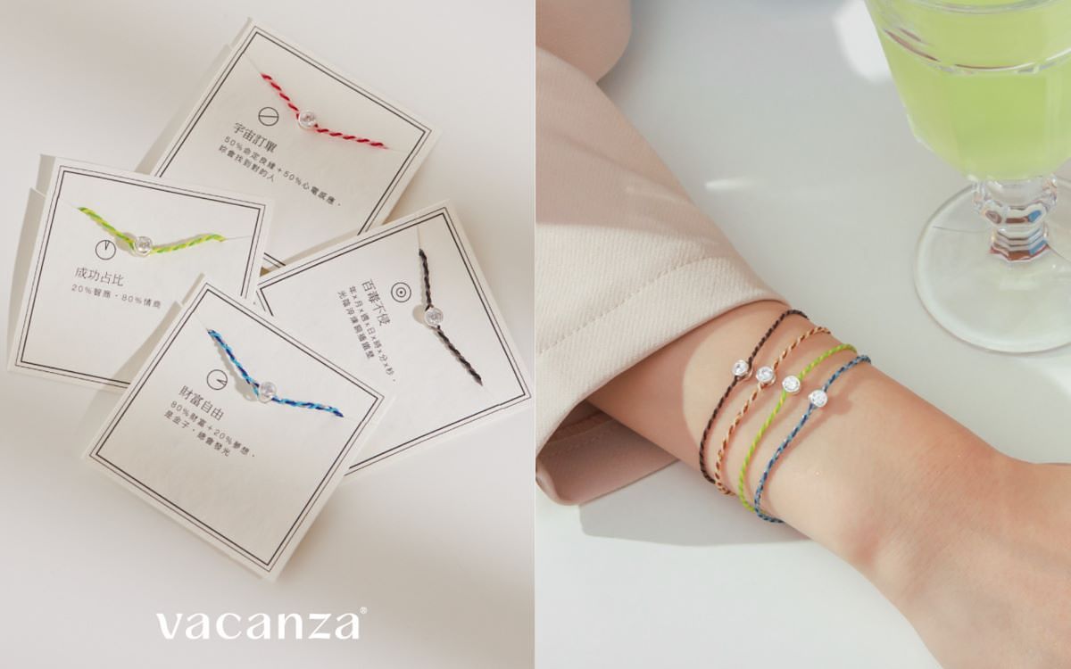 台灣知名品牌vacanza自2021年7月推出「祈願™系列」後好評不斷,銷售在上市兩個月內突破萬條銷售,社群搜尋聲量也居高不下!隨後vacanza在2021年12月與大甲鎮瀾宮聯名12生肖祈願手鍊,限量萬條,單週全數售完!成功以台灣底蘊文化出發,發揚本土風情及挖掘台灣人迷信、對信仰的虔誠。在「祈願™系列」的規劃上,vacanza聽到大眾的心聲,趁勝追擊在今年四月推出「雙色雙效款」,手鍊的材質、編織更加精進,期望帶給消費者加倍雙乘的好運;此外,更推出四色的「中性款」,期待每個配戴的消費者,「線」在好事發生!