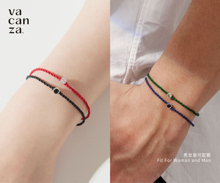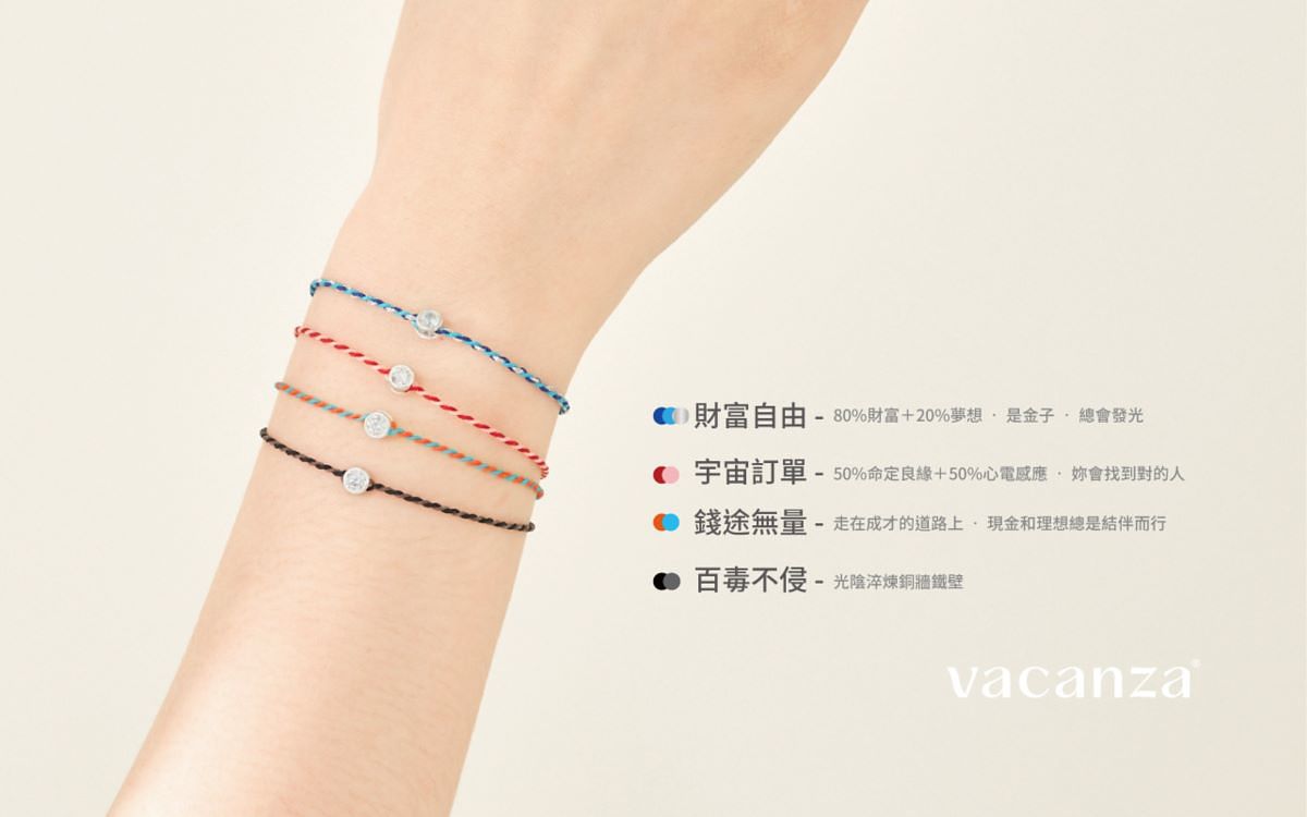 全新「雙色雙效款」以《 祈願 • 大人說 》為主題,完美體現「大人宣言」—小朋友才做選擇,我全都要!一共推出八種色系搭配,從顏色象徵的意義對應功效,並賦予幽默的產品名稱,直接對應著消費者們最嚮往、最想要獲得的力量。全新「雙色雙效款」延續vacazna祈願™系列的特色,耀眼單鑽採用硬度僅次於鑽石的5A鋯石, 並選用925全純銀,小小一條精緻度與亮度都是最高品質;新款祈願系列在編織上使用2股及3股編織,選用優質蠟繩,不管是洗澡、睡覺,都可以一直配戴著祈願™系列手鍊,讓好運不離身。不管是洗澡、睡覺,都可以一直配戴著祈願™系列手鍊,讓好運不離身。