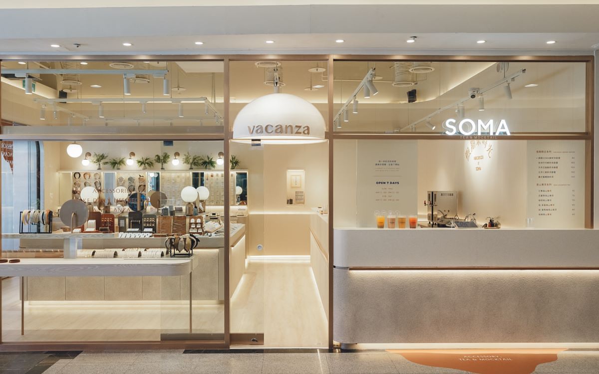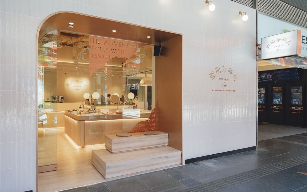 走在台北信義商圈街道上,每當逛街逛累,是否苦於無處可邊休息、邊享受飲品紓緩疲憊感呢?台灣知名飾品品牌 vacanza 期望讓每個人感受生活中假期篇章,將既有的台北信義威秀門市翻新設計,打造全新「假期茶時光 vacanza x SOMA」,繼台北中山假期咖啡町後,vacanza攜手知名特調飲品SOMA,結合飾品與特調鮮奶茶,帶來升級感購物饗宴。以質感奶茶色為主調,將店內打造嶄新的購物空間體驗,店外無框架階梯座位,讓熙攘的人潮可在此小憩一下,期望每個人在台北信義商圈中,用一杯奶茶的時間,讓美好的假期從當下開始!