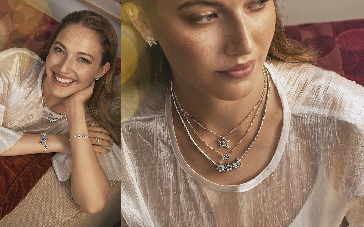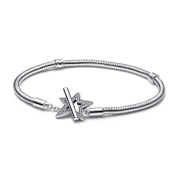 全新兩款Pandora Moments手鏈款式,包括星形T字釦蛇形手鏈及流星雙圈手鏈,為節日造型注入奇妙星光魔法。