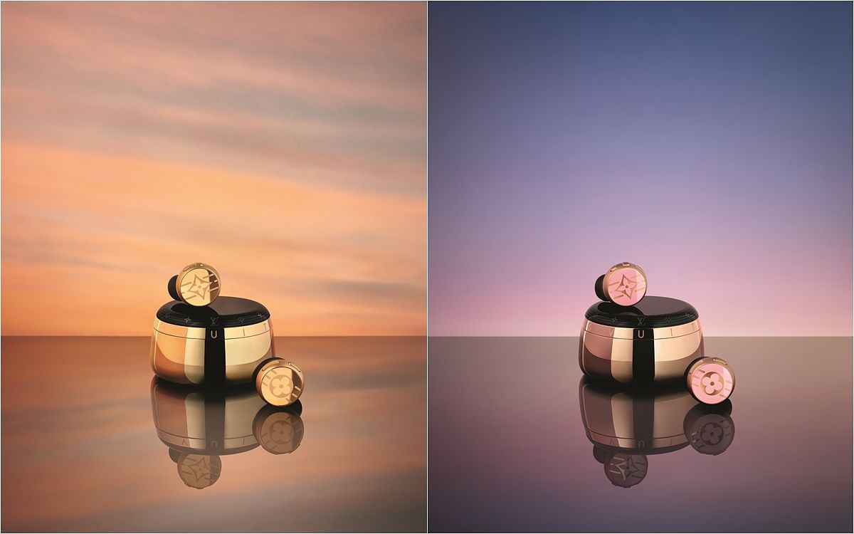 充電盒與腕錶如出一轍,上飾有路易威登的 Connected Monogram 圖案。LED 背光照明功能使得這些圖案呈現萬花筒般美麗的漸層顏色。除了美學上的迷人魅力,這些燈光另能顯示電池電量。當電光舞蹈結束後,剩下的三個燈號便會顯示充電盒及耳機的電量多寡。