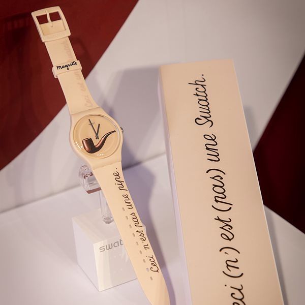 馬格利特 (Magritte) 融合了文字遊戲和圖像的力量,這點可從其 1929 年 La trahison des images(形象的叛逆)一作中見得。「Ceci est une Swatch ( 這是一支 Swatch )」和藝術原作中的「Ceci n’est pasune pipe ( 這不是一支菸斗 )」成為錶帶上的吸睛細節。玩味十足的包裝讓整個體驗成無真正的超現實主義,並融入達達主義, 完美轉化為 Swatch 風格。