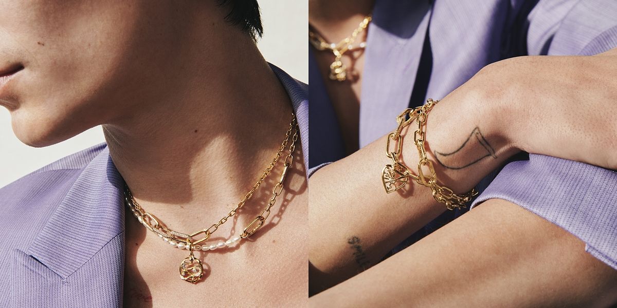 Pandora ME系列推出全新設計,將低調而充滿神秘感的珍珠元素融入經典鏈圈飾品當中,重新詮釋雋永珍珠時尚,演繹無限可能。人工淡水養殖珍珠項鏈及手鏈款式,設有兩個可打開的連接釦,可隨意裝飾鏈圈; 更可調校鏈圈長度,加入其他同系列的飾牌或迷你吊飾,探索不同面向的自己。時裝界新寵兒Evan Mock佩戴了Pandora ME人工淡水養殖珍珠細項鏈,及鍍14k金雙鏈圈項鏈串上圓牌吊飾; 珍珠與飾鏈的結合,為穿搭注入造型魅力。