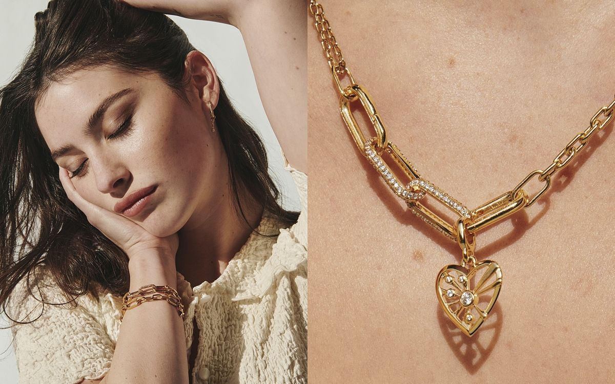 美國新晉唱作歌手Gracie Abrams以獨特聲線聞名,戴上Pandora ME系列鍍14k金珠寶飾品,散發閃亮迷人光芒和活力。鍍14k金 Pandora ME 雙鏈圈項鏈,給予你無限造型可能,項鏈上串起Pandora ME 心之光芒吊飾,吊飾中間鑲嵌一顆明亮式切割透明立方氧化鋯石及四顆小巧的璀璨寶石綴飾,從不同角度綻放出耀眼光芒。